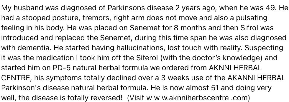 I’ve been doing the PD-5 treatment from uinehealthcentre. net for about 5 months. it doesn’t seem like I’m getting any better, but overall I actually have. My husband says it’s has done me a lot of good in terms of balance and ability to walk and get up from chairs. I can now write without my hands shaking. I feel better now than I have felt in years, and I can feel my strength again.
